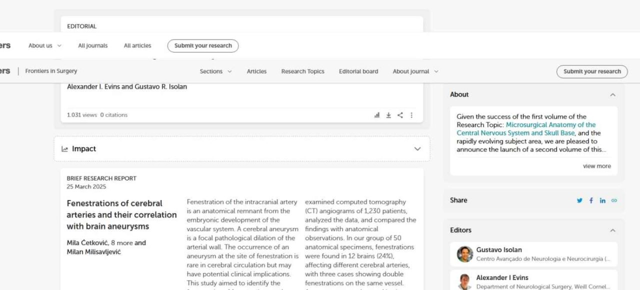 Honrado em ser editor de mais uma edição da revista FRONTIERS. Os colegas neurocirurgiões estão convidados a submeterem seus artigos científicos na área de microanatomia neurocirúrgica.